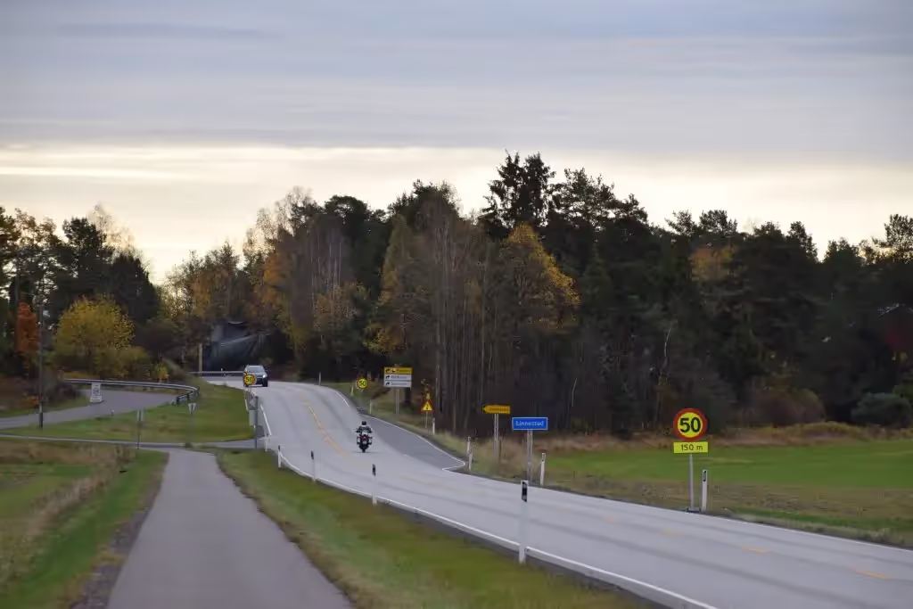 Nøkkelpoeng: - Blink i god tid, flytt deg inn i fartsreduksjonsfeltet når det begynner, og senk farten først når du er inne i feltet. - Ikke kjør i sperreområder eller over sperrelinjer ved starten av feltet. - Vær oppmerksom på anbefalt fart og kurvatur i avkjøringsrampen; farten må ofte videre ned etter at du har forlatt hovedveien.